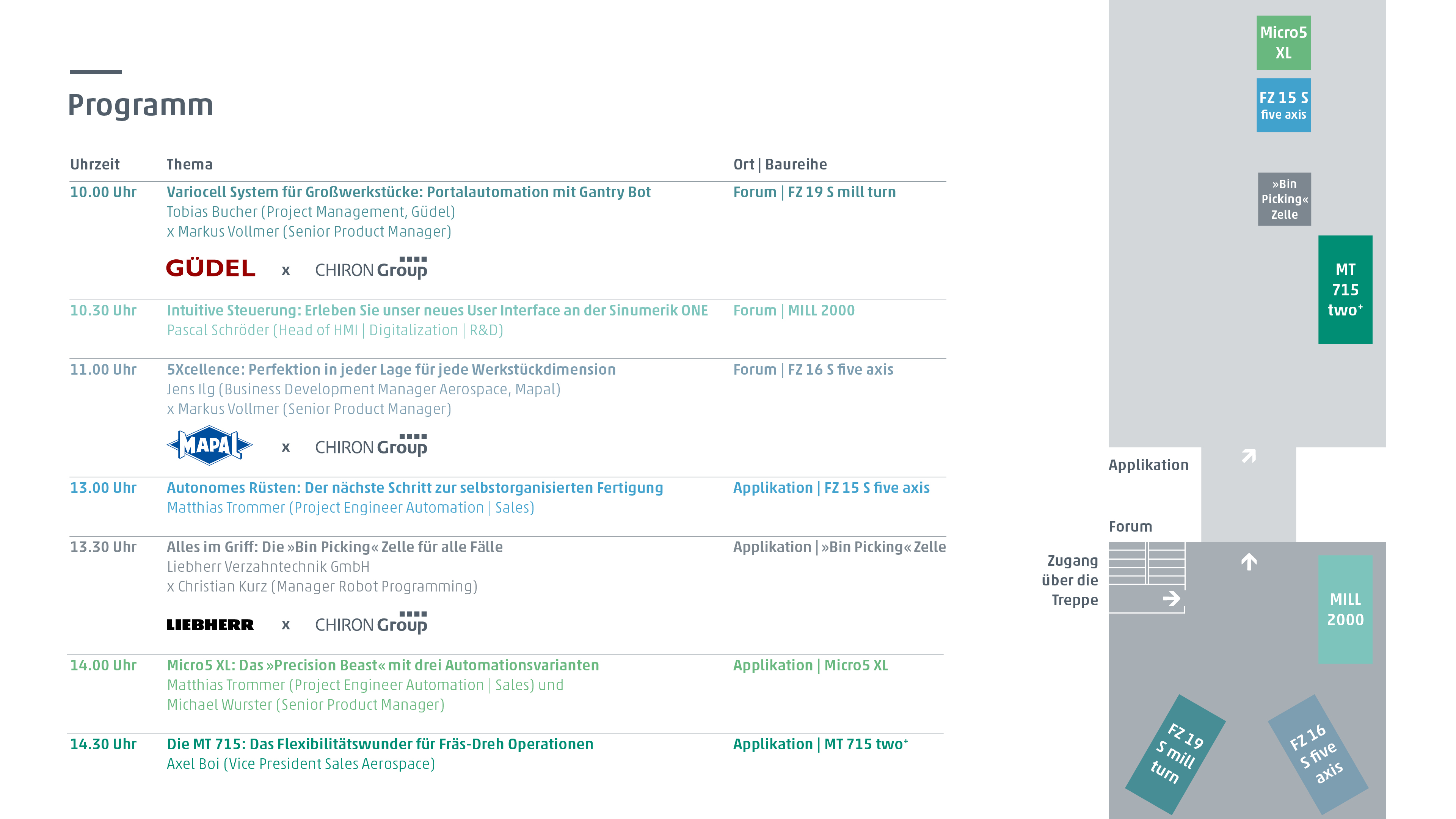 Auf über 1.500 Quadratmetern präsentieren wir Ihnen eine große Vielfalt an Bearbeitungszentren unter Span, gebündeltes Know-how von 35 Partnerunternehmen und zeigen innovative Automatisierungs-Premieren. Werfen Sie schon jetzt einen Blick in unsere Vorschau. Wir freuen uns auf Ihren Besuch in Tuttlingen!