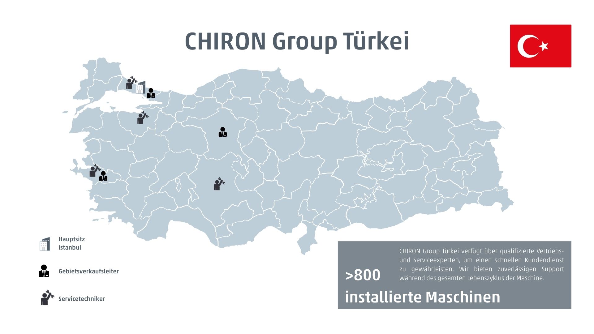CHIRON Group Türkei ist seit 2010 Teil der CHIRON Group und verfügt über drei Standorte in Istanbu, Izmir und Bursa. Die Kompetenzen der CHIRON Group Türkei sind der Verkauf mit Projektteam sowie Serviceleistungen für CHIRON Group Maschinen. In jedem Projekt stellen wir die Interessen und den Nutzen des Kunden in den Vordergrund und arbeiten von der Angebotserstellung bis zur Abnahme der Maschine eng und partnerschaftlich mit unseren Kunden zusammen.